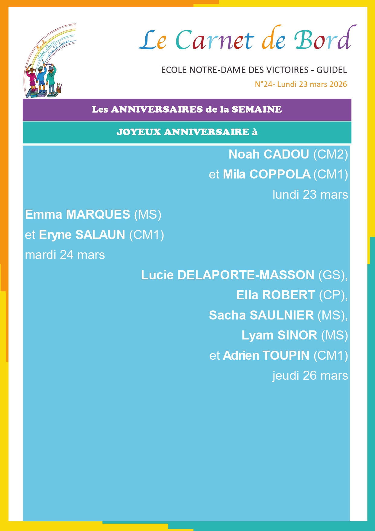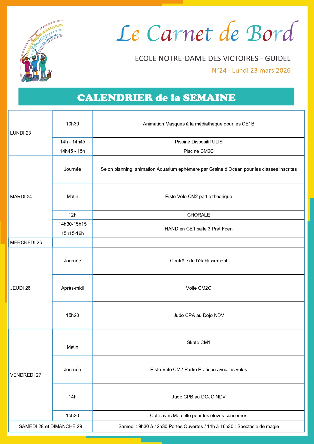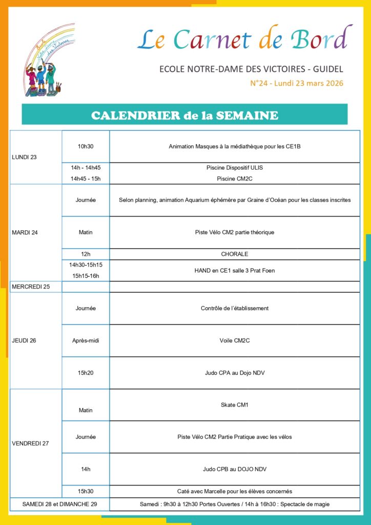 Mardi 24 mars : Aquarium épéhmère avec Graine d’Océan / Piste vélo CM2 (théorie) / Hand CE1